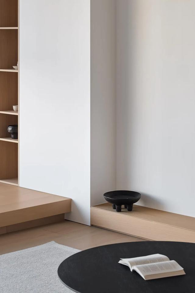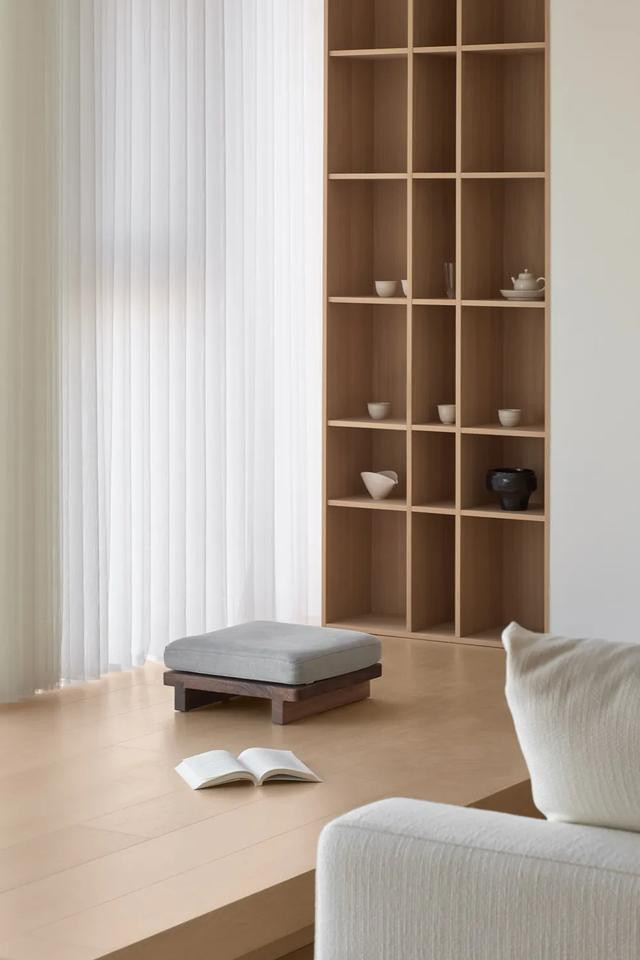 阳台经地面抬升,自成一片天地。墙体精细测量方格陈列,探寻室中器物与主人心性的契合度。