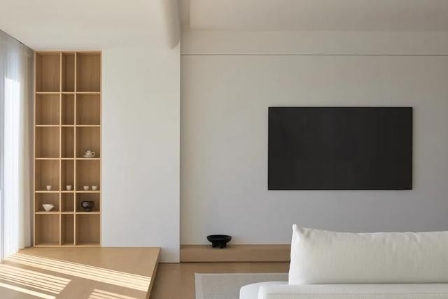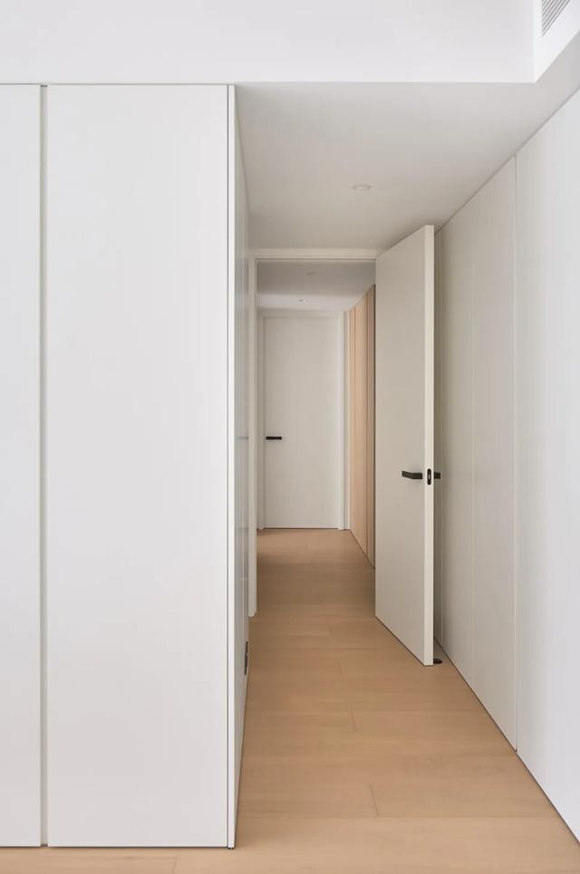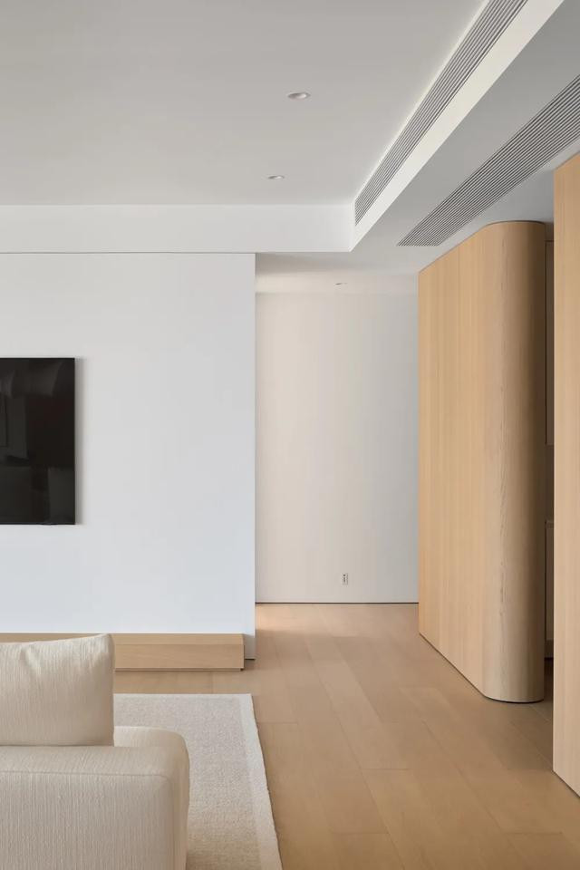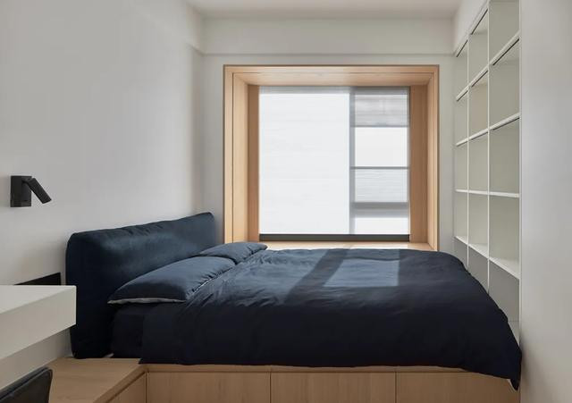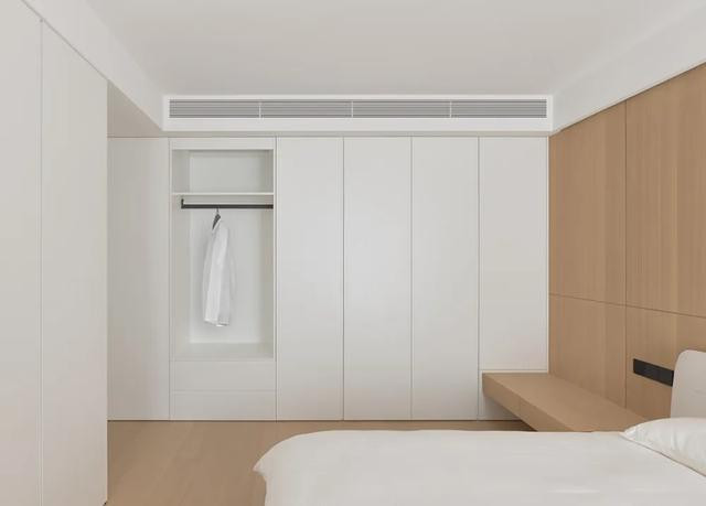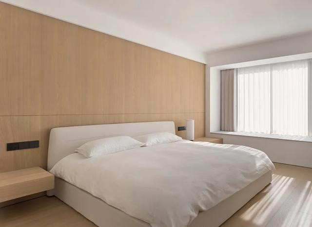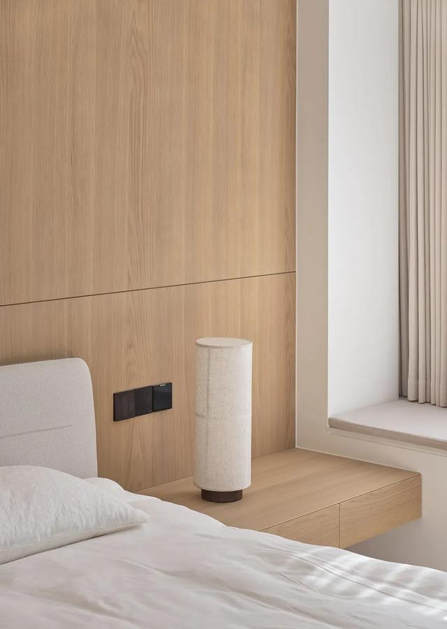 主卧延续舒缓主调,温暖木质与润白肌理互构联系,描摹着低纯度的空间骨架。