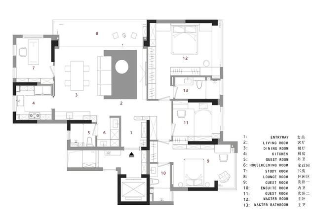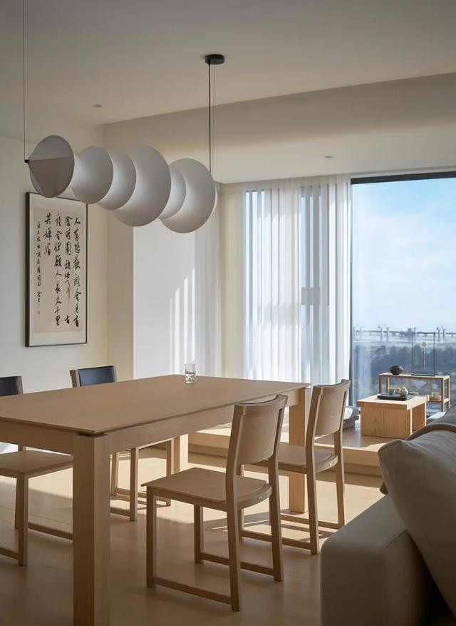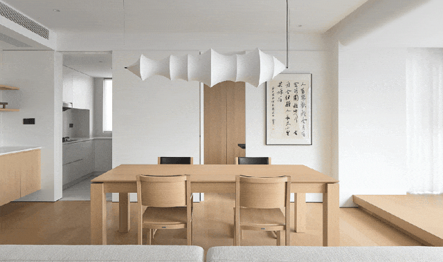餐厅与沙发互为递进的开放式关系,同步散射至厨房、书房形成更多维度的交流环境。