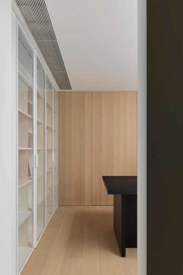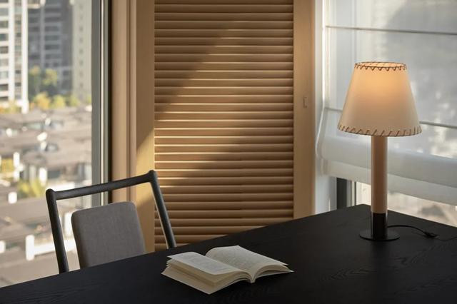 书房内保留了三处采光面,尽数吸纳明亮与生机。设计分别在两处窄窗设置了,可自由开合的透气格栅与原木板。